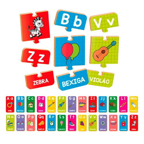 Com 26 quebra-cabeças individuais e 78 peças coloridas em madeira, cada letra do alfabeto vem associada a um objeto familiar e ilustrativo, facilitando a memorização e o reconhecimento visual. Ideal para mães que desejam preparar seus pequenos para a alfabetização de forma natural e divertida.